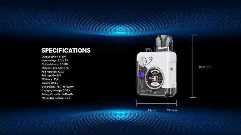 合金+PCTG机身,钢化玻璃面板+TFT圆形显示屏+RGB灯效,可切换主题。5-30w可调2ml容量吸阻可调 另购一体弹 95一盒三颗